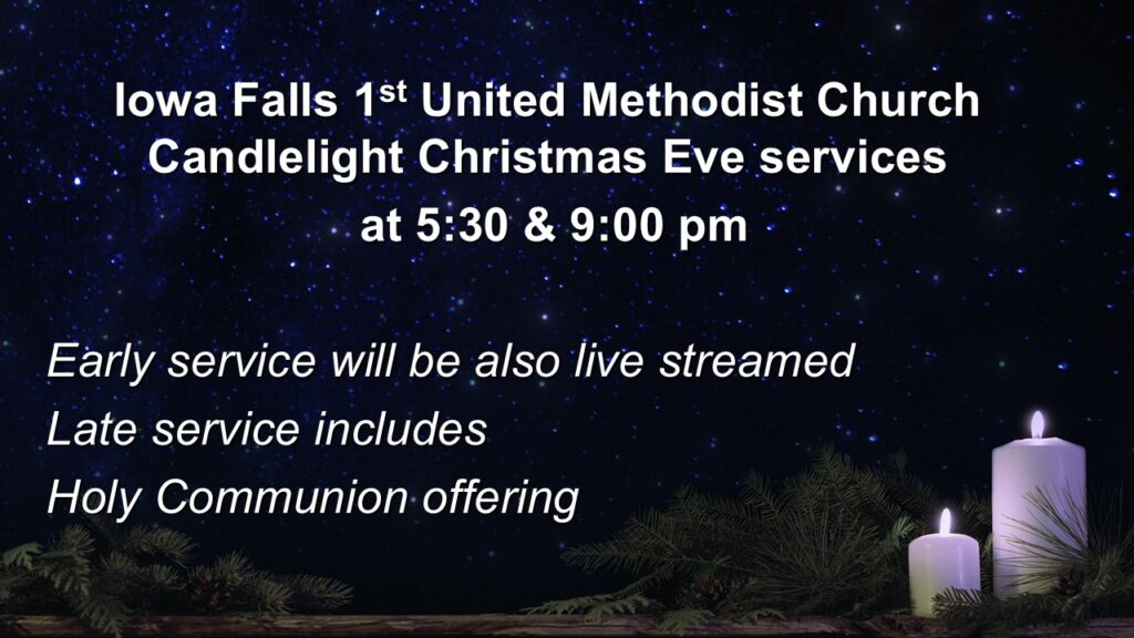 Join us at Church at 5:30pm on Saturdays or Sundays at 9 am and Wednesday at 6:15pm Find our livestreaming of the 9 am service at Iowa Falls 1st United Methodist YouTube page.